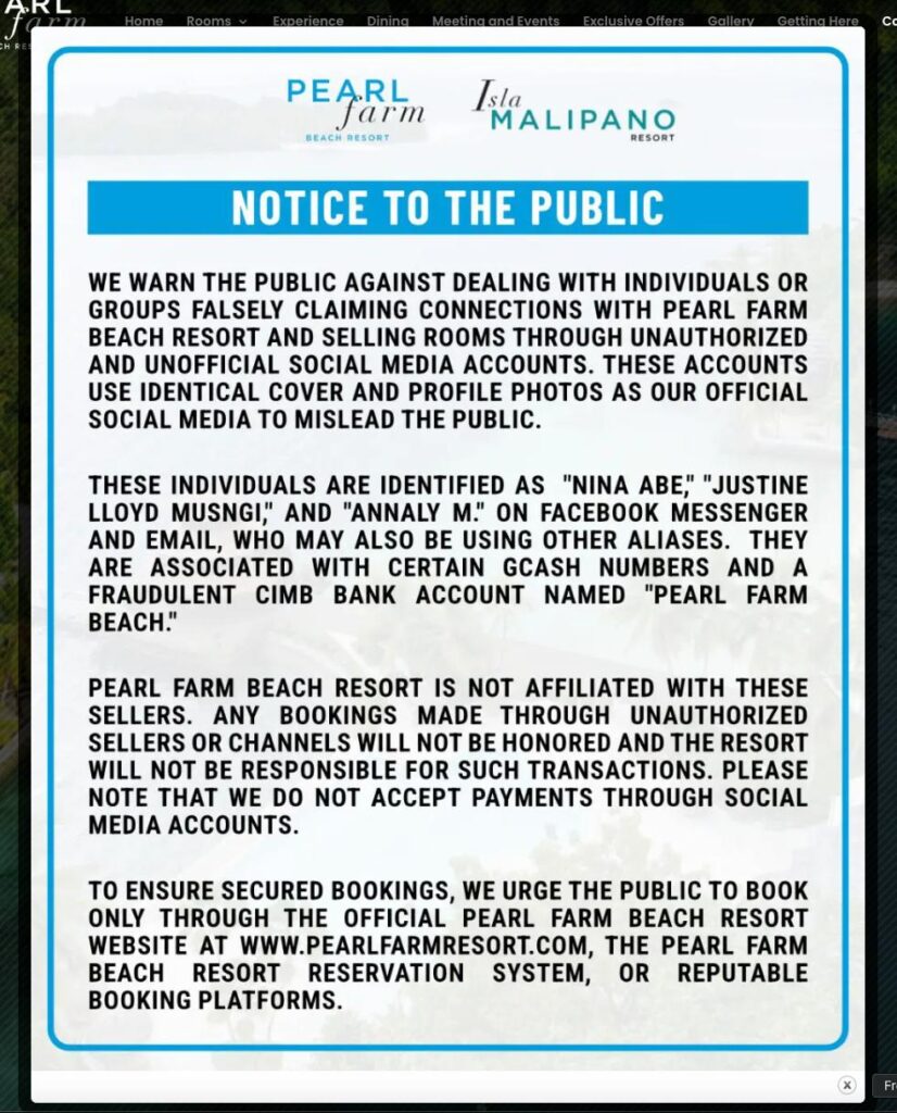 - Add a scam warning on your website. Pearl Farm even added a popup on their site warning visitors about fake accounts. If you have a website, a simple notice or popup can remind people to only book through your official channels.
